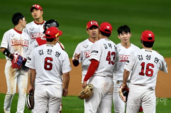 SSG가 LG를 상대로 5-3으로 승리한 뒤 선수들이 그라운드에서 기쁨을 나누고 있다.