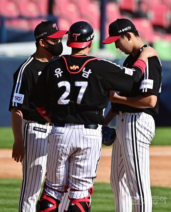 12일 서울 잠실야구장에서 열린 ‘2021 신한은행 SOL KBO리그’에서 두산 베어스와 LG 트윈스의 더블헤더 1차전 경기에서 4회말 무사 만루 상황에서 LG 손주영이 투수코치와 이야기를 하고 있다.