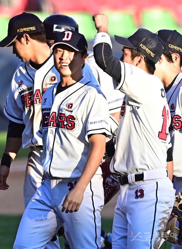12일 서울 잠실야구장에서 열린 ‘2021 신한은행 SOL KBO리그’에서 두산 베어스와 LG 트윈스의 더블헤더 1차전 경기에서 두산이 LG에 8-5로 승리를 거둔 뒤 정수빈과 허경민이 장난을 치고 있다.