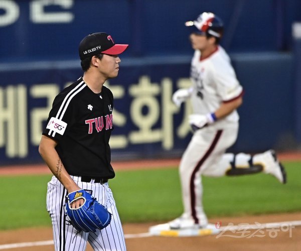 12일 서울 잠실야구장에서 열린 ‘2021 신한은행 SOL KBO리그’에서 두산 베어스와 LG 트윈스의 더블헤더 2차전 경기에서 1회말 무사 1루 두산에 투런포를 허용한 LG 이상영이 아쉬워하고 있다.