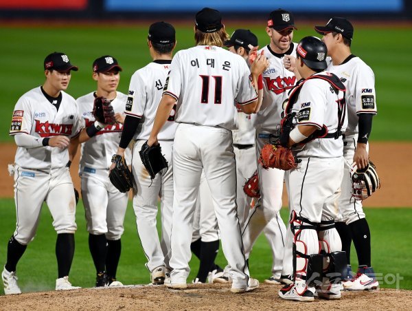 kt가 SSG를 상대로 3-2로 승리한 뒤 선수들이 그라운드에서 기쁨을 나누고 있다.