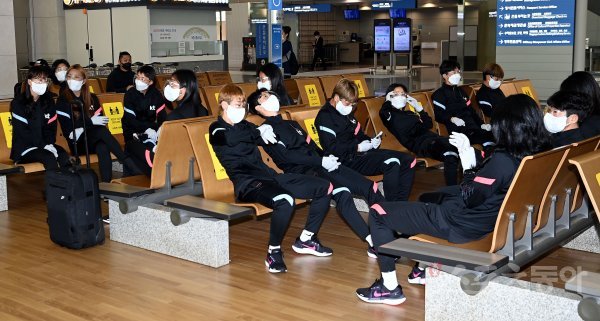 여자축구대표팀이 우즈베키스탄에서 열리는 ‘2022 AFC 여자 아시안컵 예선’에 참가하기 위해 13일 인천국제공항에 모여 출국 준비를 하고 있다.