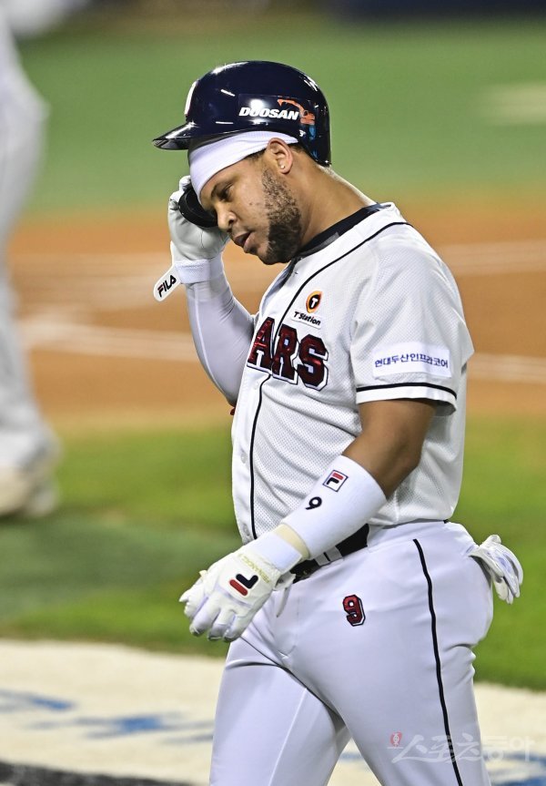 14일 서울 잠실야구장에서 열린 ‘2021 신한은행 SOL KBO리그’에서 두산 베어스와 KT 위즈의 경기에서 3회말 무사 1, 3루 두산 페르난데스가 내야 뜬공으로 물러나며 아쉬워하고 있다.