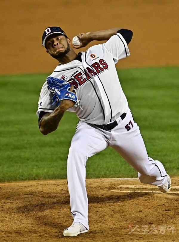 14일 서울 잠실야구장에서 열린 ‘2021 신한은행 SOL KBO리그’에서 두산 베어스와 KT 위즈의 경기에서 선발 투수로 마운드에 오른 두산 미란다가 역투하고 있다.