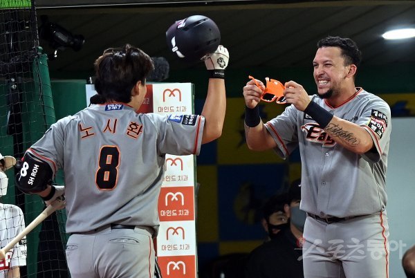 3회초 2사 1루에서 한화 페레즈가 투런 홈런을 쏘아 올린 노시환에게 선글라스를 씌워주고 있다.