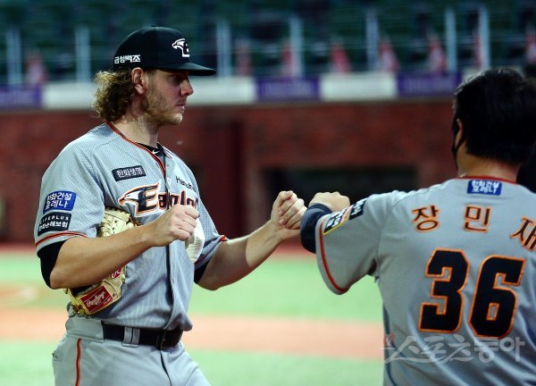 7회까지 SSG 공격을 4실점으로 막은 한화 선발 킹험이 이닝 종료 후 동료들의 환영을 받고 있다.