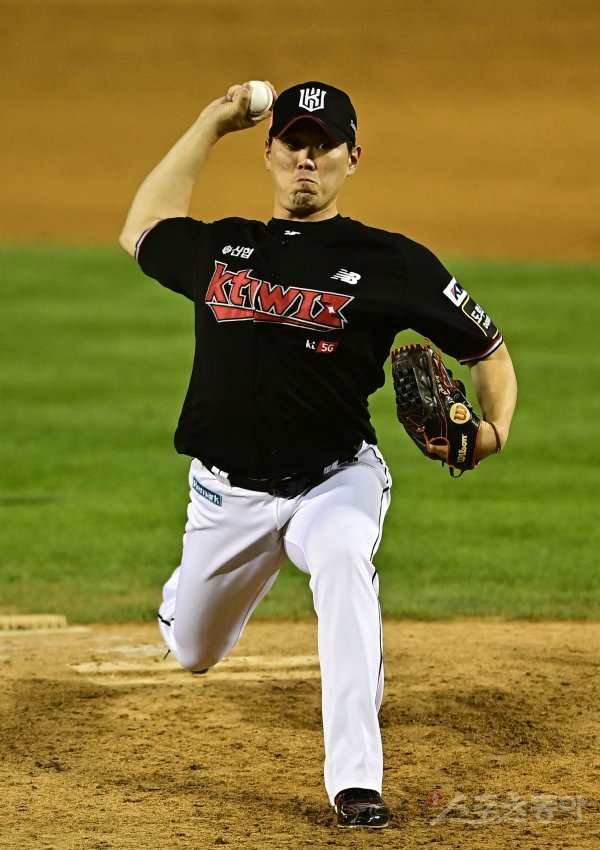 14일 서울 잠실야구장에서 열린 ‘2021 신한은행 SOL KBO리그’에서 두산 베어스와 KT 위즈의 경기에서 9회말 KT 김재윤이 교체로 마운드에 올라 역투하고 있다.