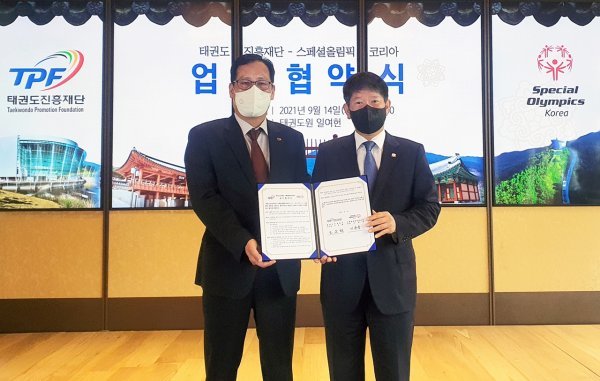 스페셜올림픽코리아(SOK·회장 이용훈)와 태권도진흥재단(이사장 오응환)이 14일 전북 무주 태권도원 일여헌에서 발달장애인의 체육 및 문화활동 참여 확대를 위한 업무협약을 체결했다.