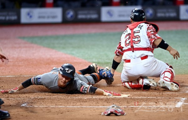3회초 1사 만루에서 적시타 때 한화 2루 주자 김태연이 SSG 이현석의 태그를 피해 득점에 성공하고 있다.