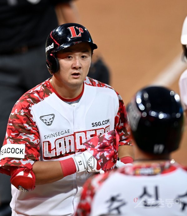 1회말 2사 2루에서 SSG 최주환이 투런 홈런을 쏘아 올린 뒤 동료의 환영을 받고 있다.