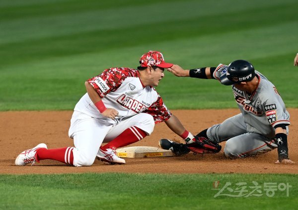 1회초 2사 1루에서 한화 하주석이 SSG 최주환의 태그를 피해 2루 도루에 성공하고 있다.