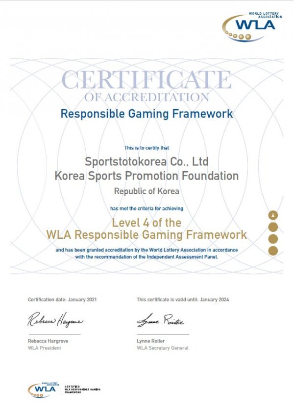 아울러 올 1월 스포츠토토코리아는 WLA의 전문가 평가단이 10대 평가요소를 통해 심사하는 세계적으로 유일한 건전화 국제표준인증인 ‘건전화 표준인증(RGF·Responsible Gaming Framework)’의 최고 등급인 4단계 재획득에도 성공한 바 있다.체육진흥투표권사업은 2011년 3단계 인증서를 획득한 뒤 2013년 9월 최초로 4단계를 인증받았다. 이어 2017년과 2021년에도 투표권사업 건전화를 위한 활동실적 및 장기추진계획 등을 인정받아 재인증을 받는 데 성공해 10년 연속으로 가장 높은 4단계의 건전화 등급을 유지할 수 있게 됐다.