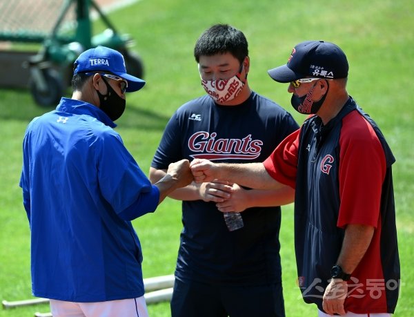 22일 부산 사직야구장에서 ‘2021 신한은행 SOL KBO리그’ 롯데 자이언츠와 삼성 라이온즈의 경기가 열린다. 경기에 앞서 삼성 김용달 코치와 롯데 서튼 감독이 인사를 나누고 있다.