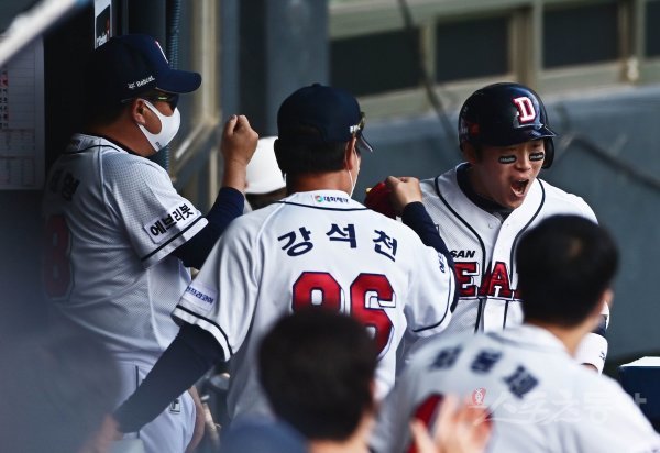 22일 서울 잠실야구장에서 열린 ‘2021 신한은행 SOL KBO리그’에서 두산 베어스와 NC 다이노스의 경기에서 3회말 1사 1, 3루 두산 허경민이 좌월 3점 홈런을 쳐낸 뒤 더그아웃에서 김태형 감독의 축하를 받고 있다.