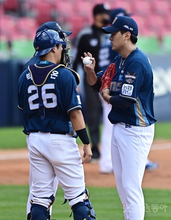 22일 서울 잠실야구장에서 열린 ‘2021 신한은행 SOL KBO리그’에서 두산 베어스와 NC 다이노스의 경기에서 1회말 2사 1, 3루 상황에서 NC 송명기가 포수와 이야기를 하고 있다.