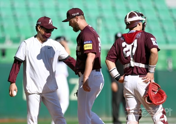 22일 인천 SSG랜더스필드에서 ‘2021 신한은행 SOL KBO리그’ 키움 히어로즈와 SSG 랜더스 경기가 열렸다. 선발 투수로 등판한 키움 요키시가 4회말 2사 2루 상황에서 강판되고 있다.