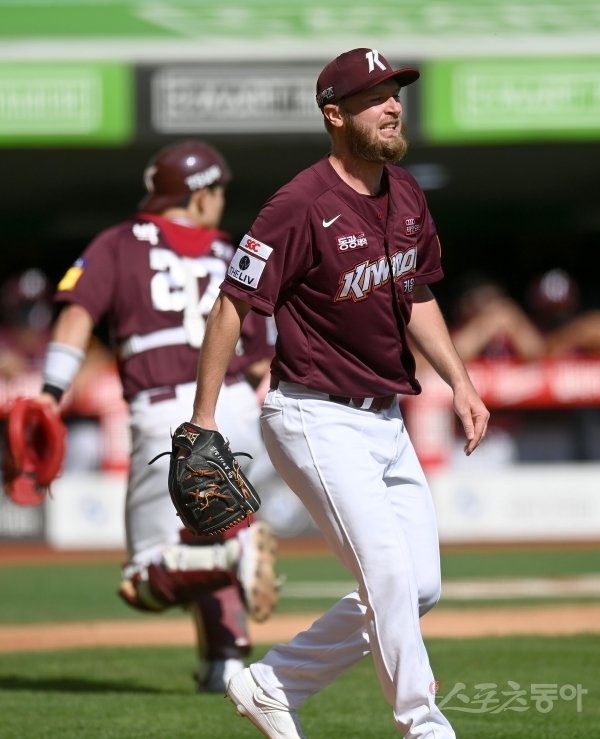 22일 인천 SSG랜더스필드에서 ‘2021 신한은행 SOL KBO리그’ 키움 히어로즈와 SSG 랜더스 경기가 열렸다. 선발 투수로 등판한 키움 요키시가 2회말 2사 만루 SSG 내야 땅볼 타구를 잡았으나 송구 실책을 범한 후 아쉬워하고 있다.