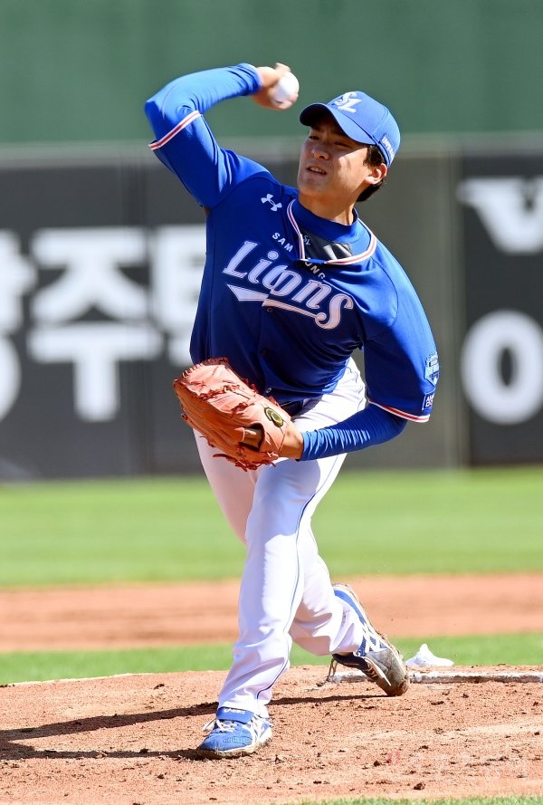 22일 부산 사직야구장에서 ‘2021 신한은행 SOL KBO리그’ 롯데 자이언츠와 삼성 라이온즈의 경기가 열렸다. 삼성 선발투수 이재희가 힘차게 볼을 던지고 있다.