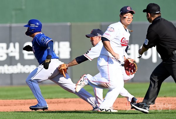 5회초 1사 1, 2루에서 폭투 때 삼성 2루 주자 김민수가 3루로 달리다 롯데 안치홍에게 태그 아웃되고 있다.