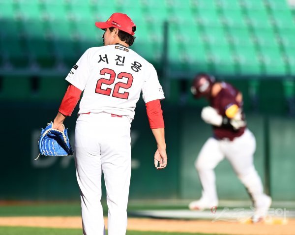 SSG 서진용이 8회초 1사 키움 박병호가 역전 좌중월 솔로 홈런을 허용하고 있다.