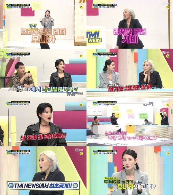 오늘 (22일) 방송되는 ‘TMI NEWS’는 ‘심쿵 주의! 우먼파워!! 연예계 대표 센 언니 BEST 15’라는 주제로 시청자를 찾아온다. 금주의 차트쇼에 가장 어울리는 오늘의 커버모델에는 신드롬급 인기를 얻고 있는 ‘스트릿 우먼 파이터’(이하 ‘스우파’)에 출연중인 프라우드먼의 리더 모니카와 라치카의 리더 가비가 동반 출연해 뜨거운 관심이 집중되고 있다.