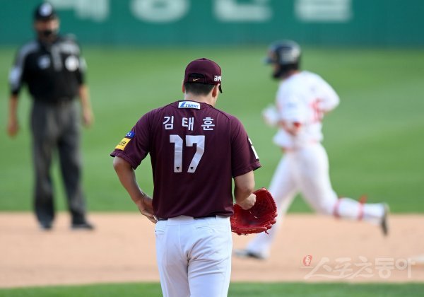 22일 인천 SSG랜더스필드에서 ‘2021 신한은행 SOL KBO리그’ 키움 히어로즈와 SSG 랜더스 경기가 열렸다. 9회말 1사 키움 김태훈이 SSG 김성현에게 동점 좌월 솔로 홈런을 허용하고 있다. 인천 | 김종원 기자 won@donga.com