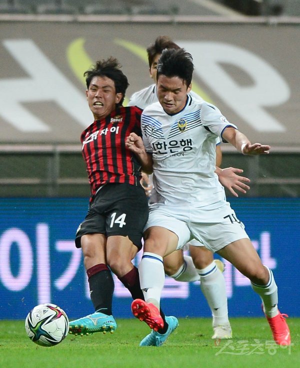 22일 서울월드컵경기장에서 열린 ‘하나원큐 K리그1 2021’ FC 서울과 인천 유나이티드의 경기에서 서울 권성윤이 인천 구본철의 수비를 피해 패스하고 있다.