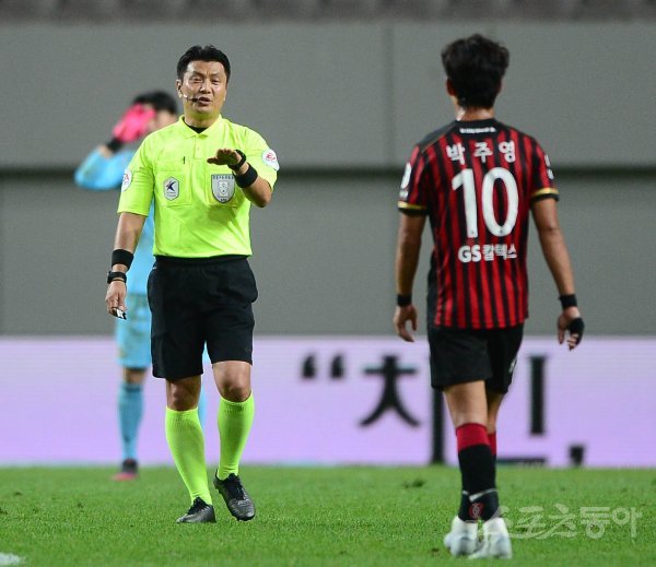 22일 서울월드컵경기장에서 열린 ‘하나원큐 K리그1 2021’ FC 서울과 인천 유나이티드의 경기에서 김동진 주심이 서울 박주영의 오프사이드를 선언하며 기성용의 골이 취소됐다.