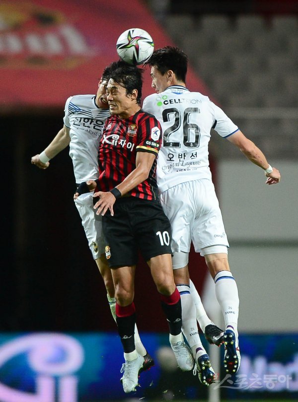 22일 서울월드컵경기장에서 열린 ‘하나원큐 K리그1 2021’ FC 서울과 인천 유나이티드의 경기에서 서울 박주영이 인천 오반석의 앞에서 헤딩을 하고 있다.
