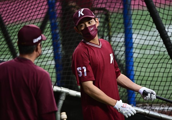 23일 서울 고척스카이돔에서 열린 ‘2021 신한은행 SOL KBO리그’에서 키움 히어로즈와 NC 다이노스의 경기에 앞서 키움 이정후가 타격 훈련 중 코치와 이야기를 하고 있다.