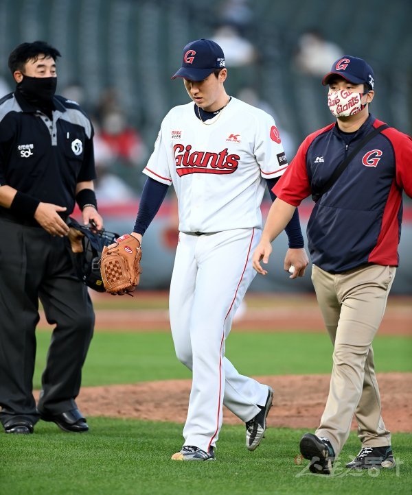 22일 부산 사직야구장에서 ‘2021 신한은행 SOL KBO리그‘ 롯데 자이언츠와 삼성 라이온즈의 경기가 열렸다. 9회초 무사 1루에서 롯데 강윤구가 부상으로 교체되고 있다. 사직 | 김민성 기자 marineboy@donga.com