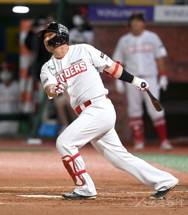 1회말 무사 1루 SSG 최정이 좌전 안타를 치고 있다.