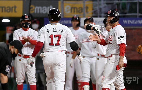 4회말 무사 1,2루 SSG 추신수가 다시 앞서가는 중월 스리런 홈런을 날린 후 그라운드를 돌아 홈인해 이재원의 축하를 받고 있다.
