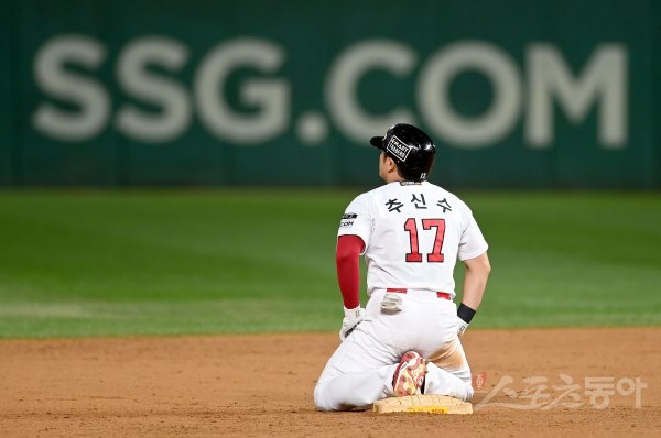 5회말 2사 1루 상황에서 SSG 1루주자 추신수가 2루 도루를 시도했으나 아웃된 후 아쉬워하고 있다.