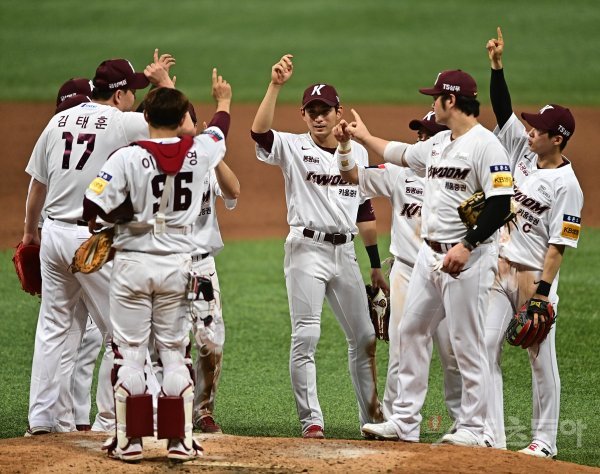 23일 서울 고척스카이돔에서 열린 ‘2021 신한은행 SOL KBO리그’에서 키움 히어로즈와 NC 다이노스의 경기에서 키움이 NC에 4-1로 승리를 거둔 뒤 선수들이 세리머니를 하고 있다.