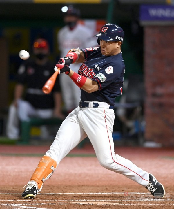 7회초 2사 1,3루 롯데 손아섭이 1타점 적시타를 치고 있다.