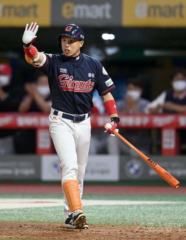 9회초 1사 1,2루 롯데 손아섭이 헛스윙 삼진 아웃 판정을 받은 후 어필하고 있다.