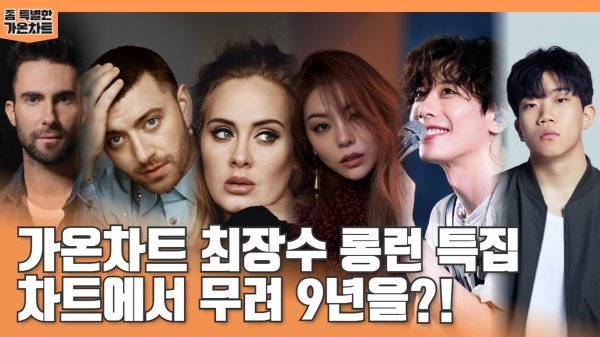 영상에 따르면 가온차트에서 가장 롱런한 국내곡 5곡은 ▲에일리 (Ailee) ‘첫눈처럼 너에게 가겠다’ (공동 4위) ▲창모 (CHANGMO) ‘아름다워’ (공동 4위) ▲엠씨더맥스 (M.C The Max) ‘어디에도’ (3위) ▲박효신 ‘야생화’ (2위) ▲ 아이유 (IU) ‘금요일에 만나요 (Feat.장이정)’ (1위)인 것으로 밝혀졌다.