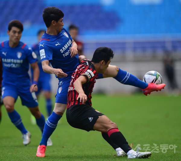 26일 수원월드컵경기장에서 열린 ‘하나원큐 K리그1 2021’ 수원 삼성과 FC 서울의 경기에서 수원 장호익이 서울의 패스를 차단하고 있다.