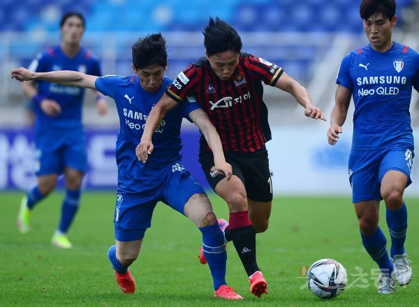 26일 수원월드컵경기장에서 열린 ‘하나원큐 K리그1 2021’ 수원 삼성과 FC 서울의 경기에서 수원 장호익이 서울 조영욱의 볼을 빼앗고 있다.