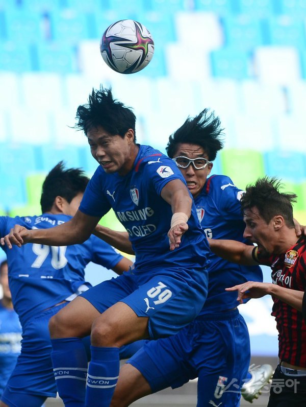 26일 수원월드컵경기장에서 열린 ‘하나원큐 K리그1 2021’ 수원 삼성과 FC 서울의 경기에서 수원 민상기가 헤딩을 하고 있다.