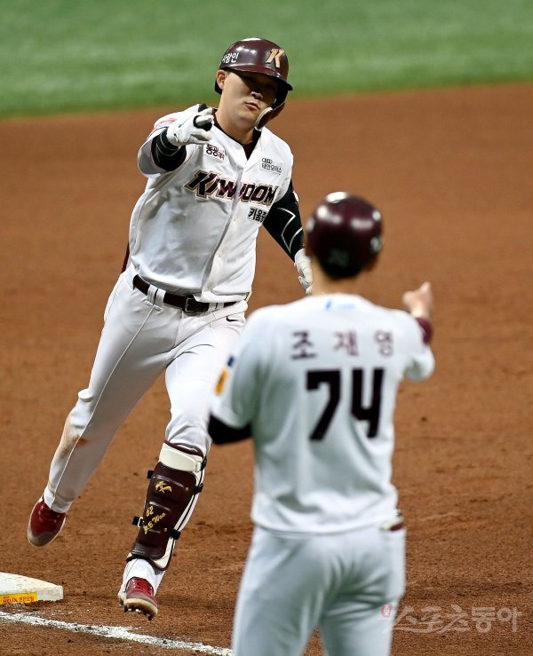 26일 서울 고척야구장에서 ‘2021 신한은행 SOL KBO리그’ 키움 히어로즈와 롯데 자이언츠의 경기가 열렸다. 4회말 2사 1루에서 키움 전병우가 투런 홈런을 쏘아 올린 뒤 세리머니를 펼치고 있다.