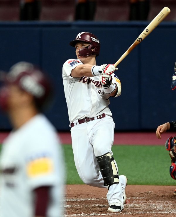 3회말 1사 1, 2루에서 키움 박동원이 3점 홈런을 쏘아 올리고 있다.
