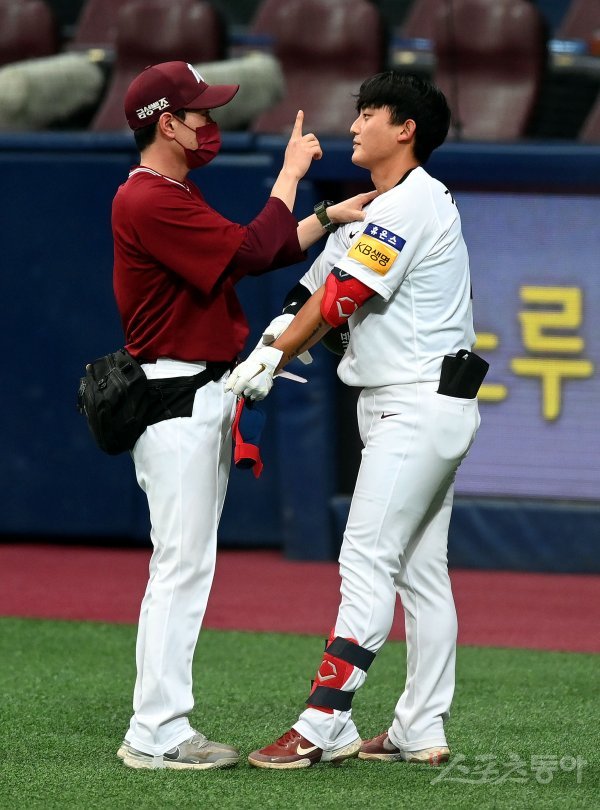 2회말 2사 1루에서 키움 김주형이 볼에 맞은 뒤 트레이너의 치료를 받고 있다.