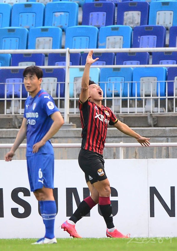 26일 수원월드컵경기장에서 열린 ‘하나원큐 K리그1 2021’ 수원 삼성과 FC 서울의 경기에서 후반전에 서울 조영욱이 선취골을 터뜨린 후 세리머니를 하고 있다.
