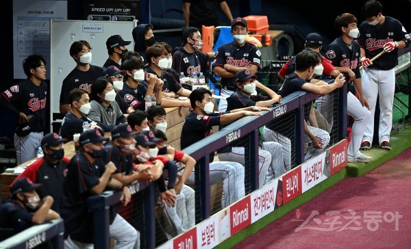 2-11로 뒤진 9회초 롯데의 마지막 공격 때 선수들이 경기를 지켜보고 있다.