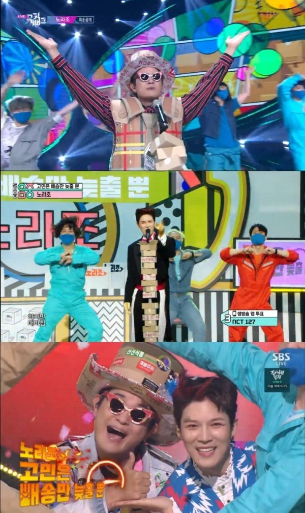 노라조는 24일 KBS 2TV \'뮤직뱅크\'를 시작으로 25일 MBC \'쇼! 음악중심\', 26일 SBS \'인기가요\' 등 공중파 3사 컴백 무대를 통해 명불허전 콘셉트 장인의 정수를 보였다. 노라조는 실제로 직접 구한 택배 박스와 쇼핑몰 장바구니를 리폼한 업사이클 의상을 착장하고 택배 박스로 스탠드 마이크를 만들었다.