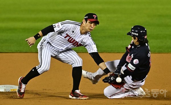 28일 서울 잠실야구장에서 열린 ‘2021 신한은행 SOL KBO리그’에서 LG 트윈스와 롯데 자이언츠의 경기에서 1회초 무사 1루 상황에서 LG 유격수 오지환이 롯데 1루주자에게 도루를 허용하고 있다.