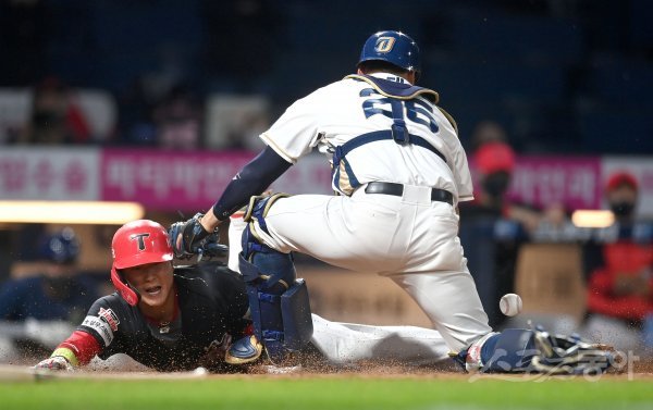 5회초 2사 2,3루 KIA 적시타 때 2루주자 김태진이 홈까지 달려 동점 득점에 성공하고 있다.