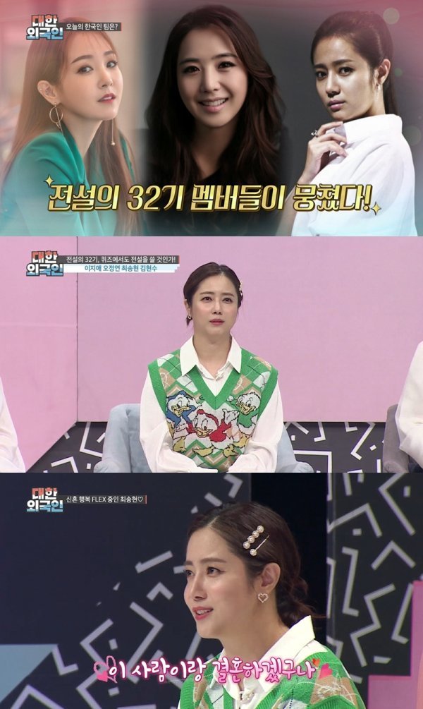 최근 진행된 ‘대한외국인’ 녹화에서 MC 김용만은 지난해 12월에 결혼을 한 최송현에게 “프러포즈는 누가 먼저 했냐”고 물었다. 최송현은 “사귀는 첫날 했다고 생각한다. 사귀는 첫날 남편과 통화할 때 남편이 ‘우리 인생의 타임라인 제일 끝에 가 봤는데 거기 백년해로가 있더라’라고 했다. 그 말을 듣는 순간 ‘이 사람과 결혼하겠구나’고 느꼈다”고 답했다.